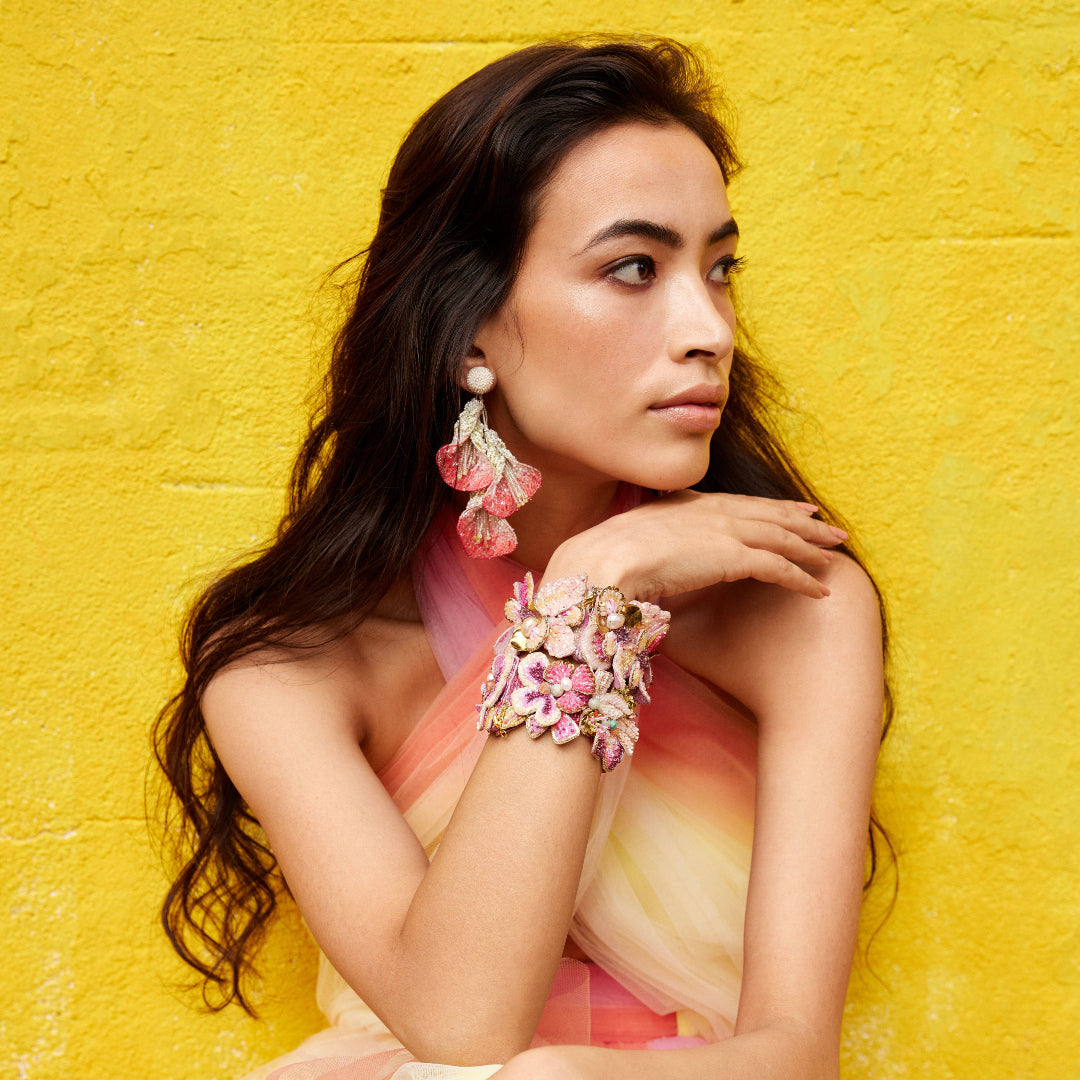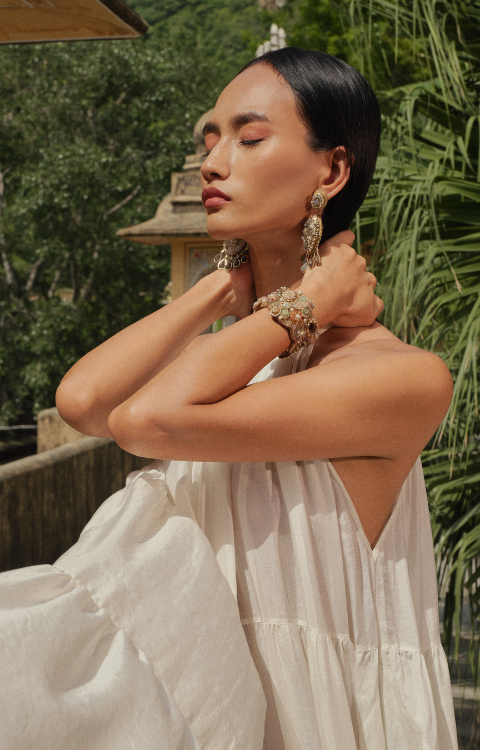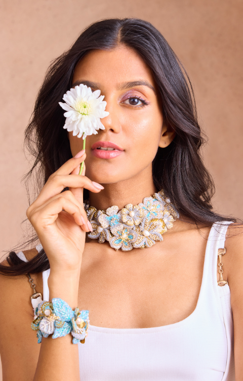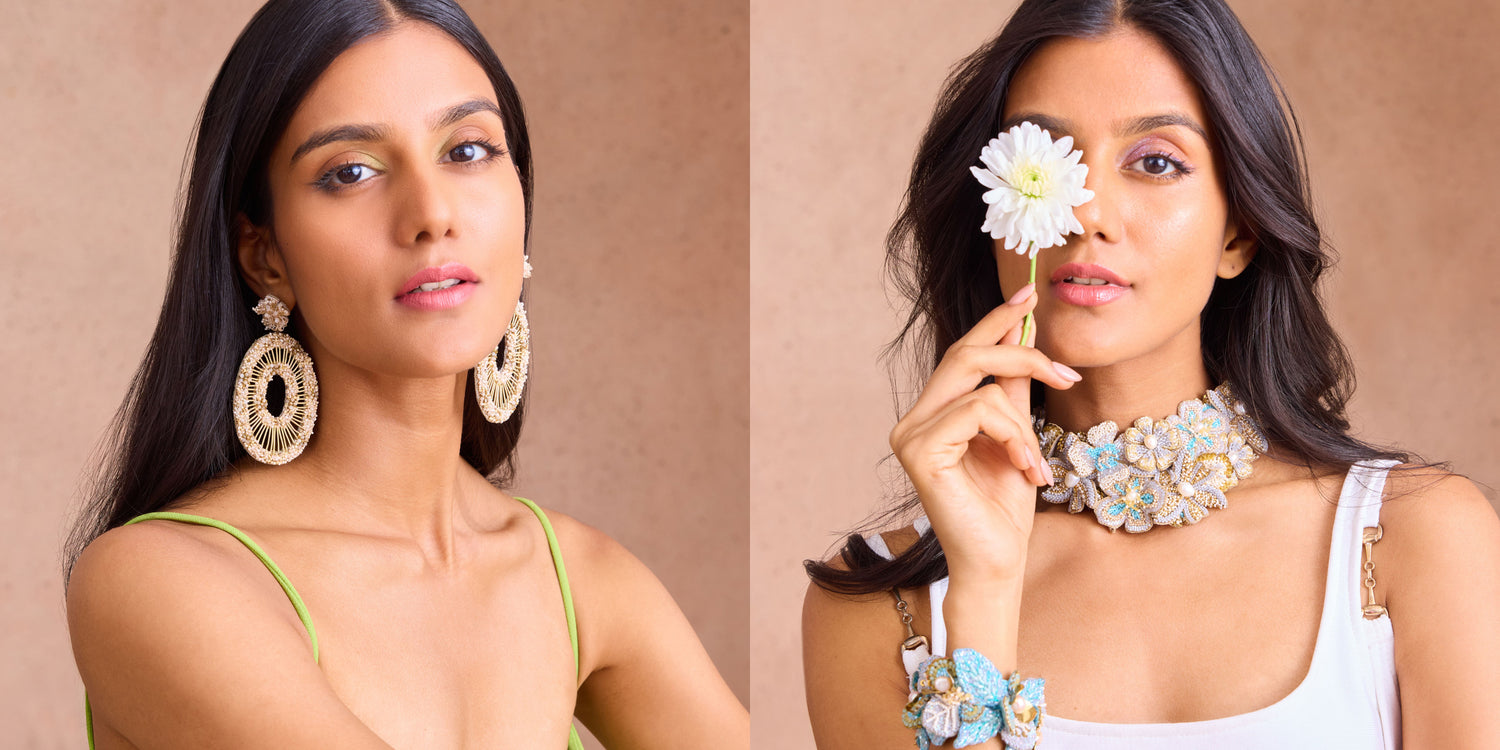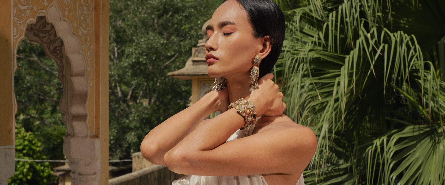 Deepa Gurnani epitomises luxury in handcrafted jewellery, renowned for its exquisite, hand-embroidered designs by skilled artisans. Each statement piece, crafted with the finest materials, showcases intricate detailing and opulent aesthetics.
