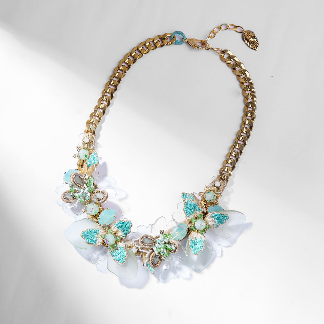 Elevate any outfit with our Calypso Necklace - a stunning handmade statement piece featuring an intricate floral design. Stand out in style and make a statement with this unique and eye-catching necklace. Perfect for any occasion.