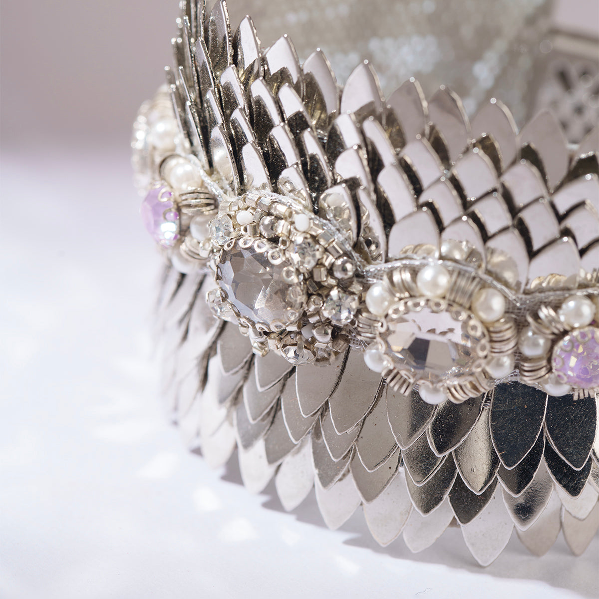 This bold cuff bracelet centered with a line of multi- colored hand embroidered crystals and clad with tiers of feather-like fringe brings texture to night-out looks.